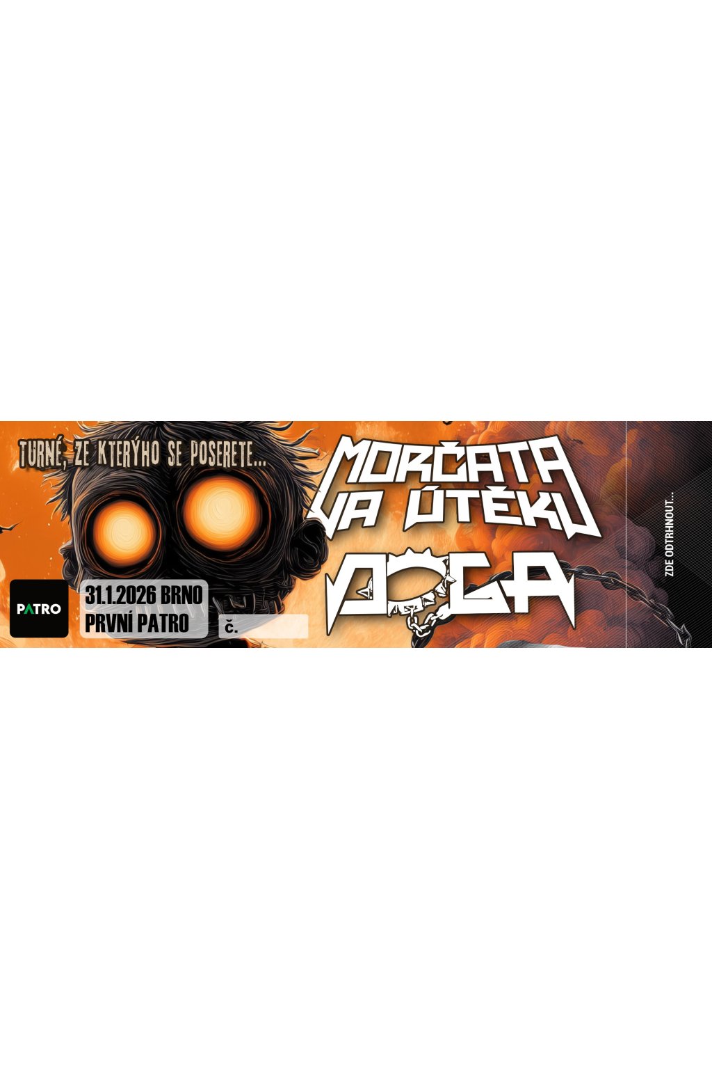 Fyzický papírový lístek na brněnský koncert, který proběhne v Prvním patře 31.1.2026. Jedná se o druhý z dvojice koncertů, kde vystoupí s Morčaty také DOGA a odstartují tam společné turné po ČR.